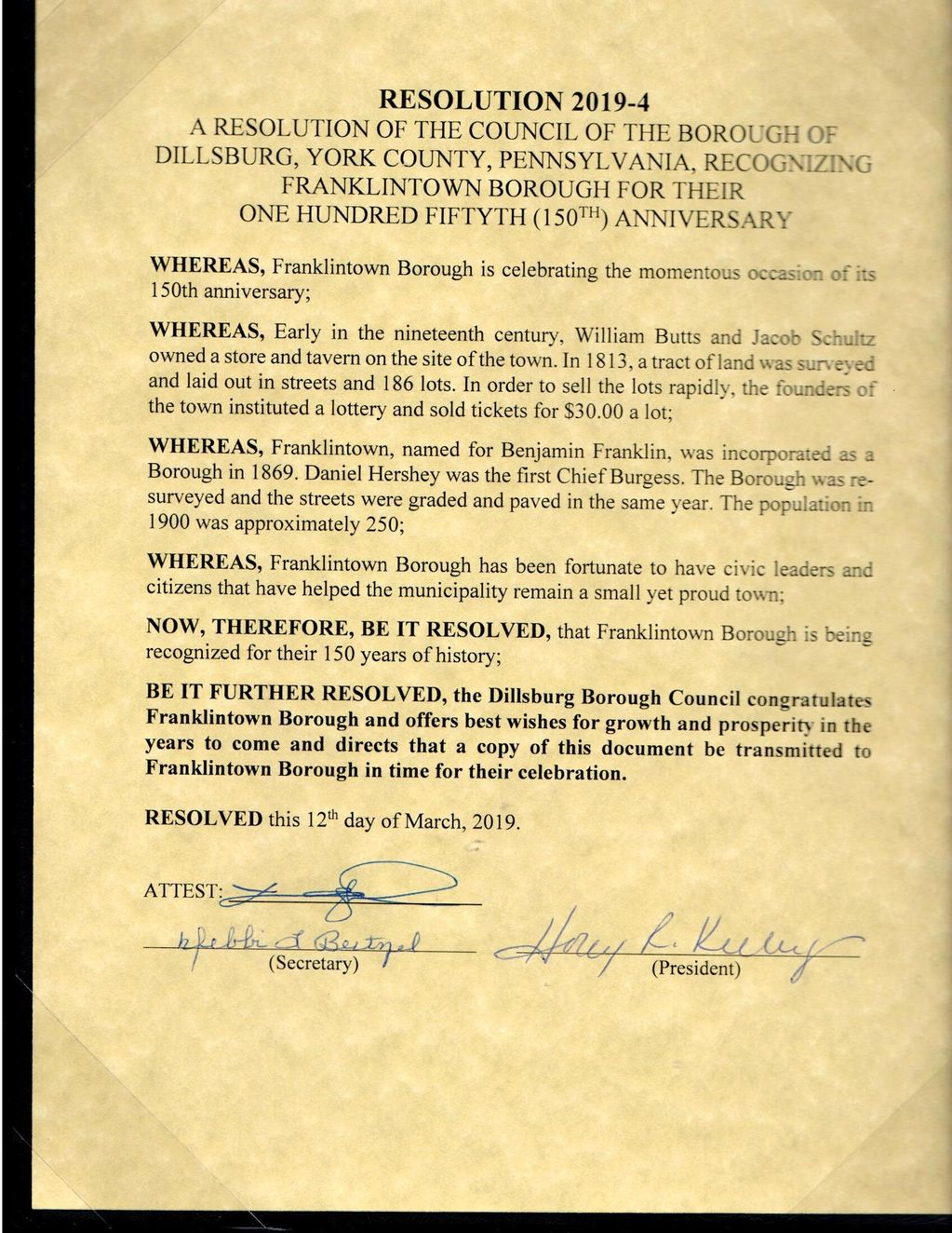 This is a Resolution from Dillsburg Borough presented to Franklintown Borough on the occassion of our 150th Anniversary of becoming a Borough.