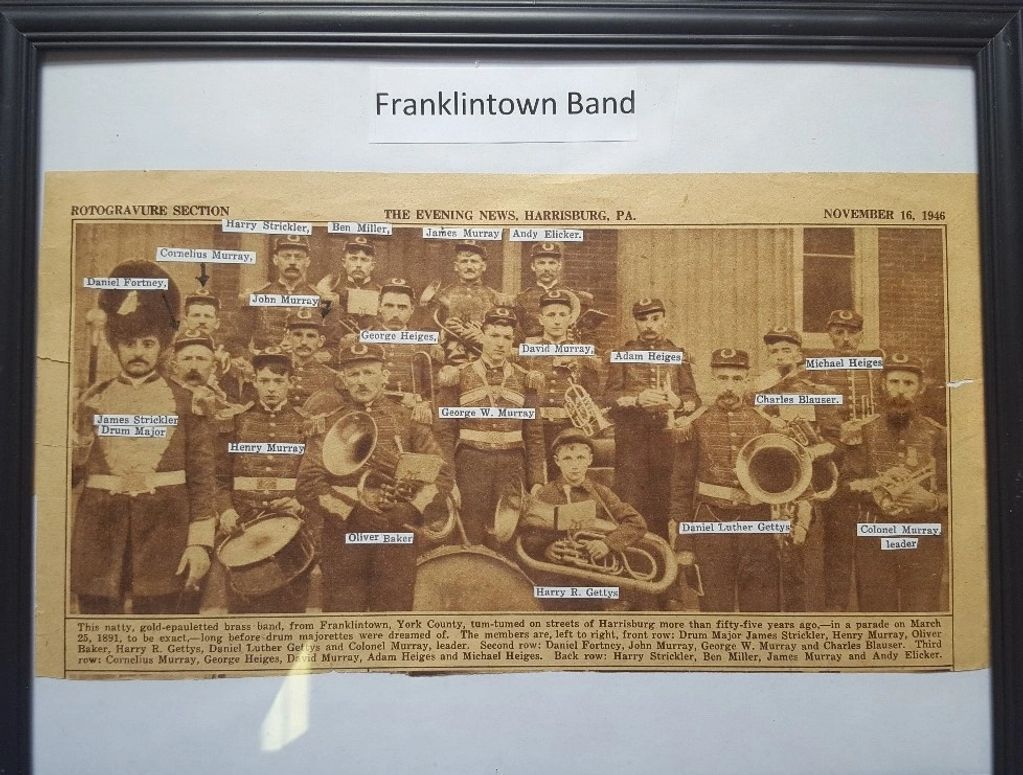Franklintown Borough has had ar rich history of music including a military band and various regular music events including the Country & Blue Grass Jam which continues to this day. Information collected by Marie Kuykendall for our 2013 150th Founders day celebration, then donated to NYCHAPS and later loaned back for our 2019 150th Incorporation Celebration and some pictures from donations to the Borough that were transferred to NYCHAPS as well.