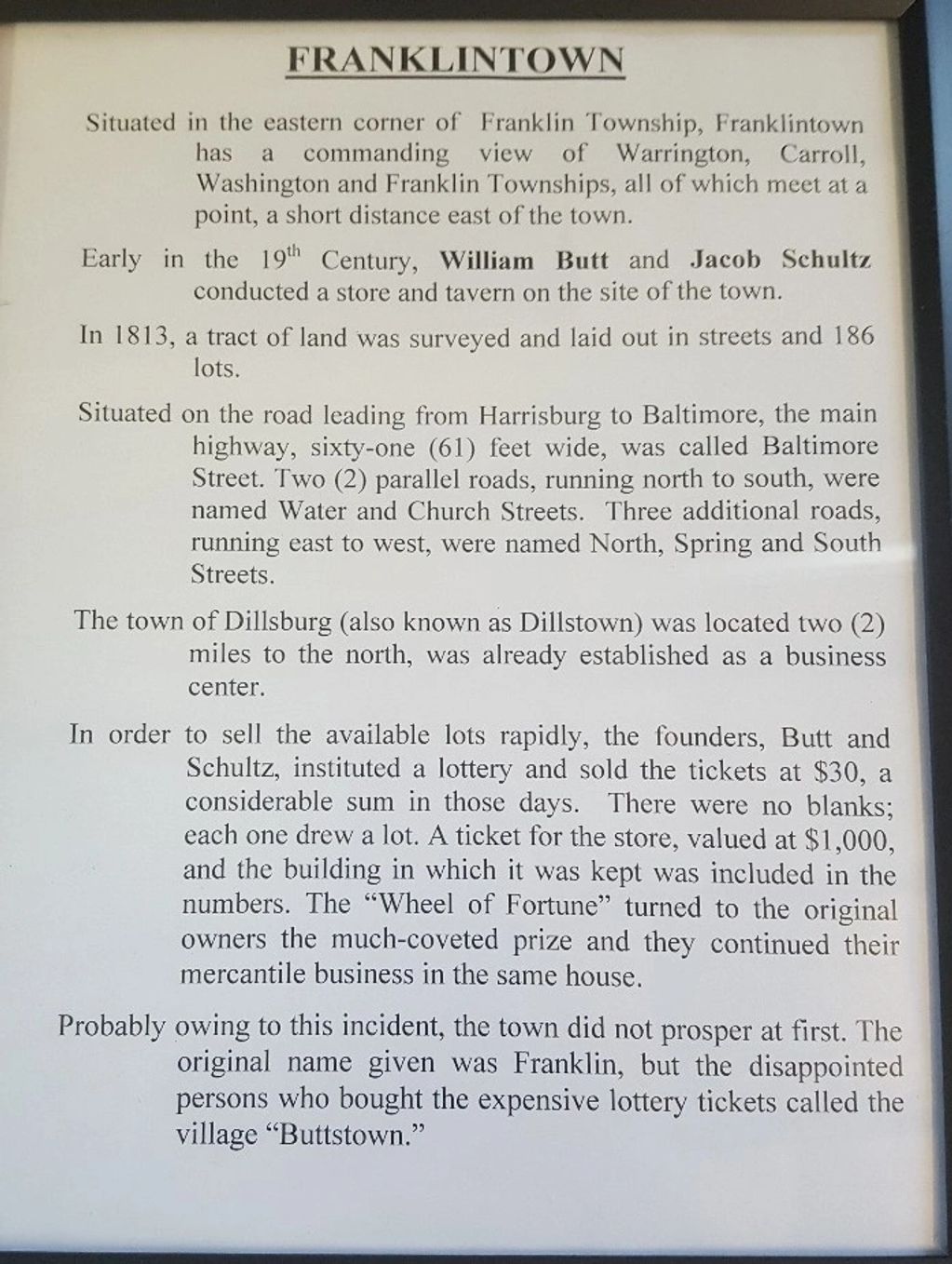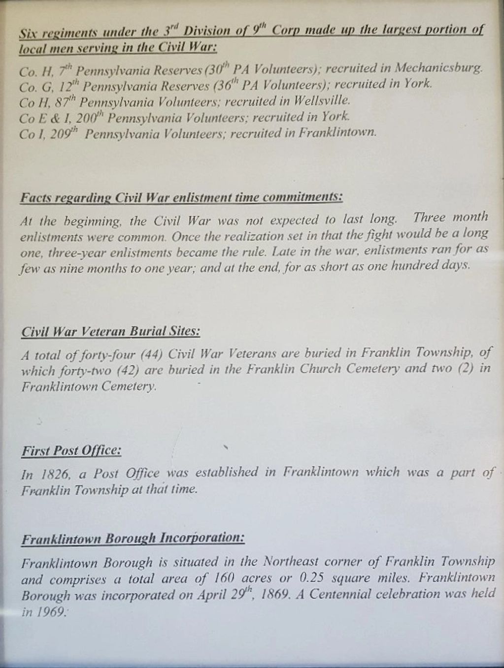 Franklintown Borough boasts two churches that wer established around the beginning of the town. Emmanuel Lutheran Church and Franklintown United Brethren Church. Information from Emmanuel Lutheran Church archives.