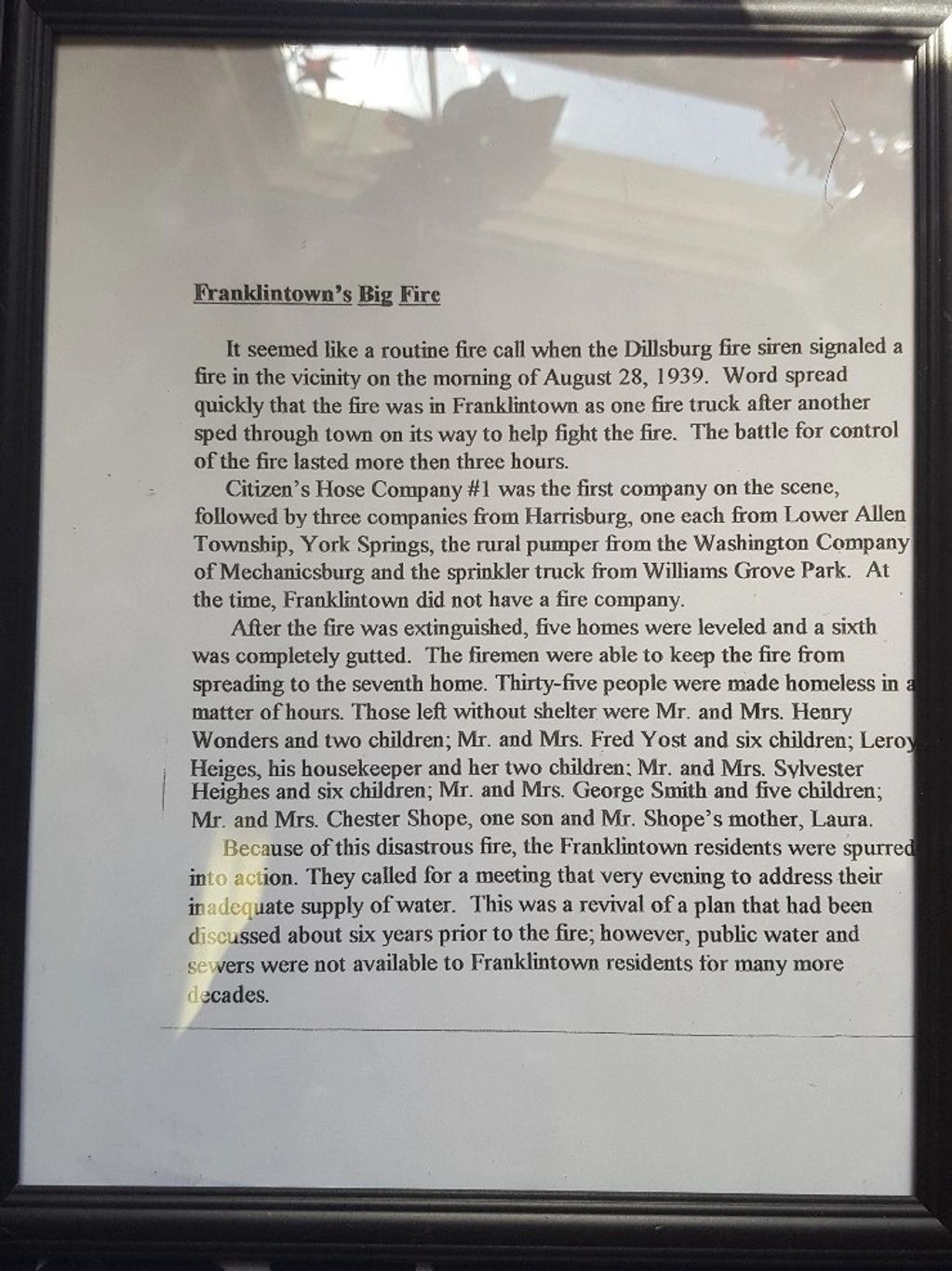 Franklintown Borough started their own Fire Company after a big fire in 1939 in which a good section of the town was destroyed. That Company lasted for approximately 76 years before merging with Dillsburg Hose in 2018 to form the now Northern York Fire Rescue. Information collected by Marie Kuykendall for our 2013 150th Founders day celebration, then donated to NYCHAPS and later loaned back for our 2019 150th Incorporation Celebration.