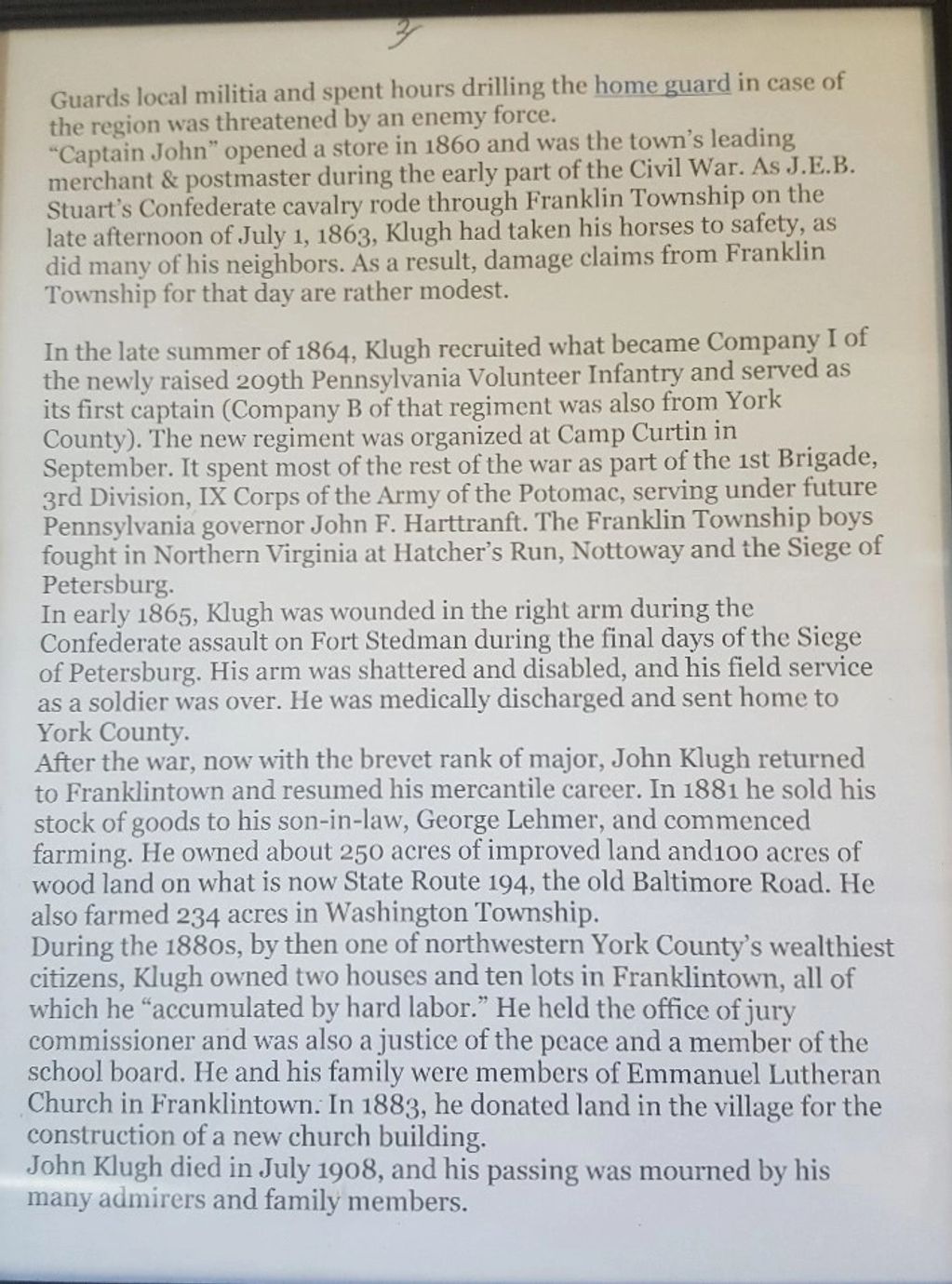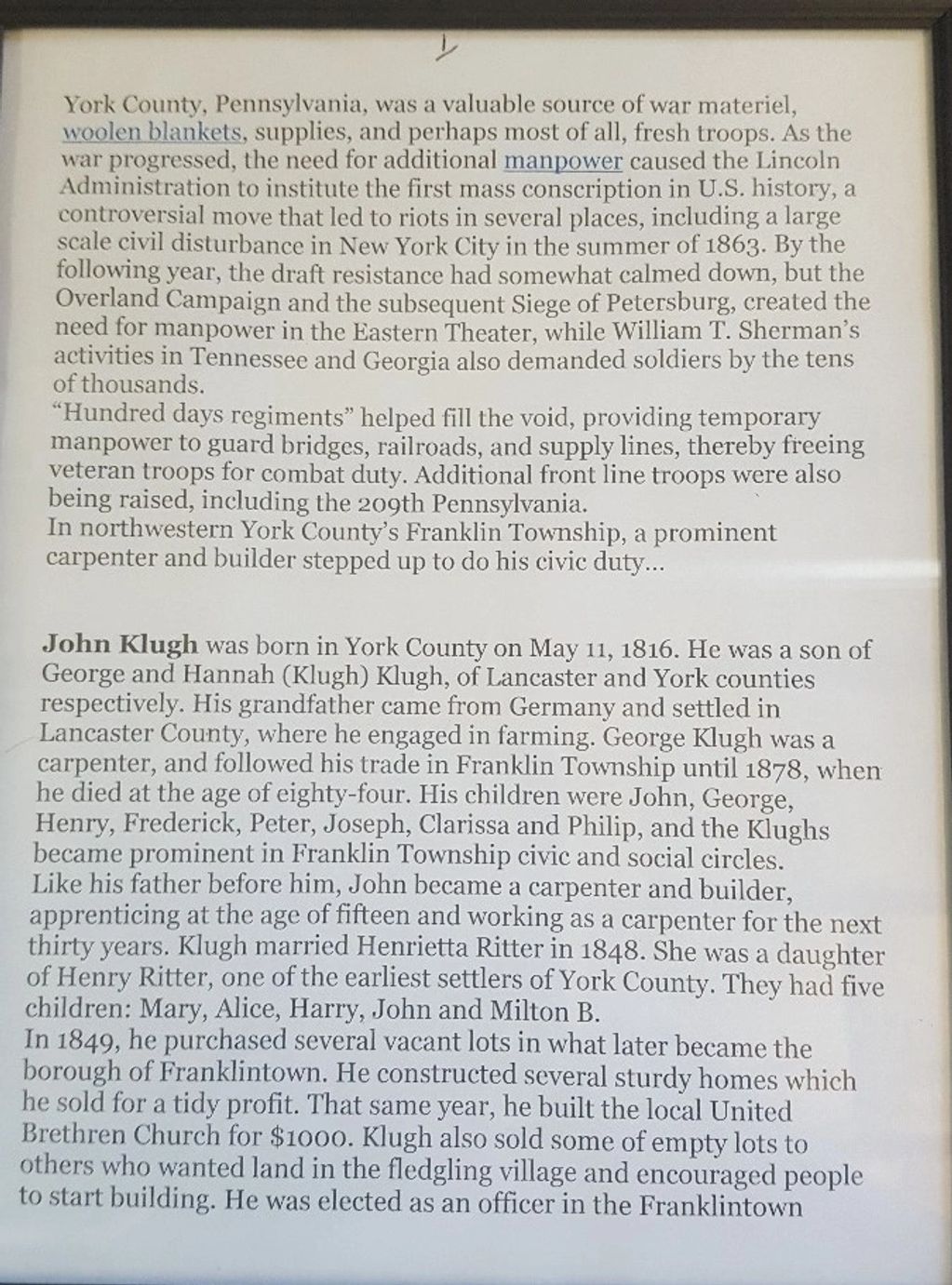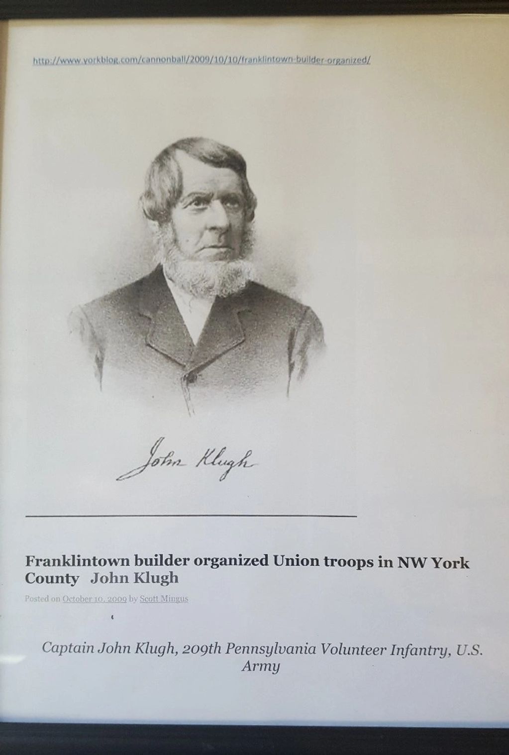 The Franklintown Guard was the name of a uniformed military company of approximately fifty volunteer members. It existed for fifteen years. During the Civil War, Captain John Klugh recruited a company from the Franklintown area that entered the Two Hundred and Ninth (209th) Regiment of Pennsylvania Volunteers in Company 1. They participated in battles in Hatcher’s Run, Fort Steadman, Nottoway and the Siege of Petersburg, all in Virginia.