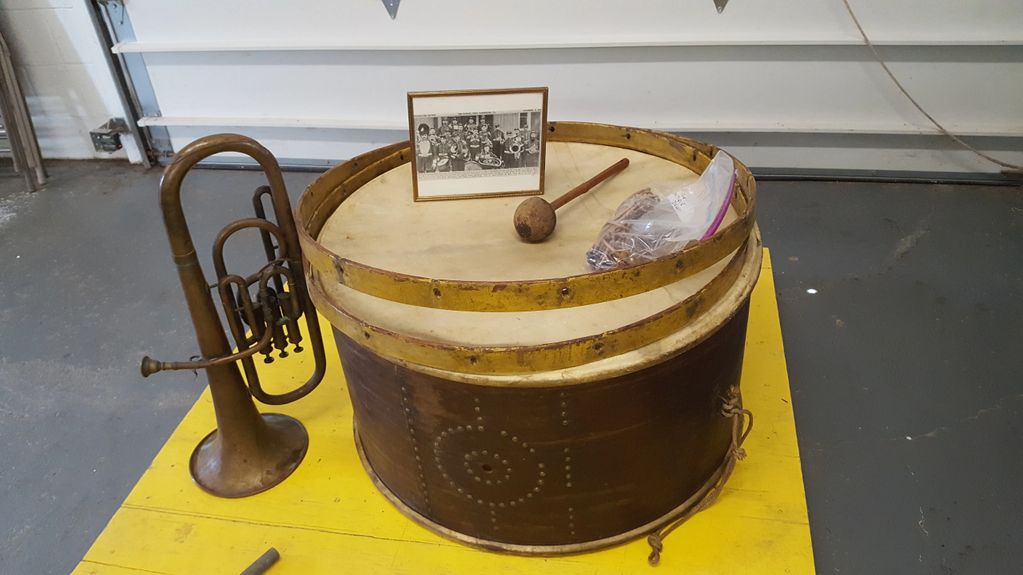 This old drum and brass instrument shown with newspaper photo they are featured in. Newspaper photo above.