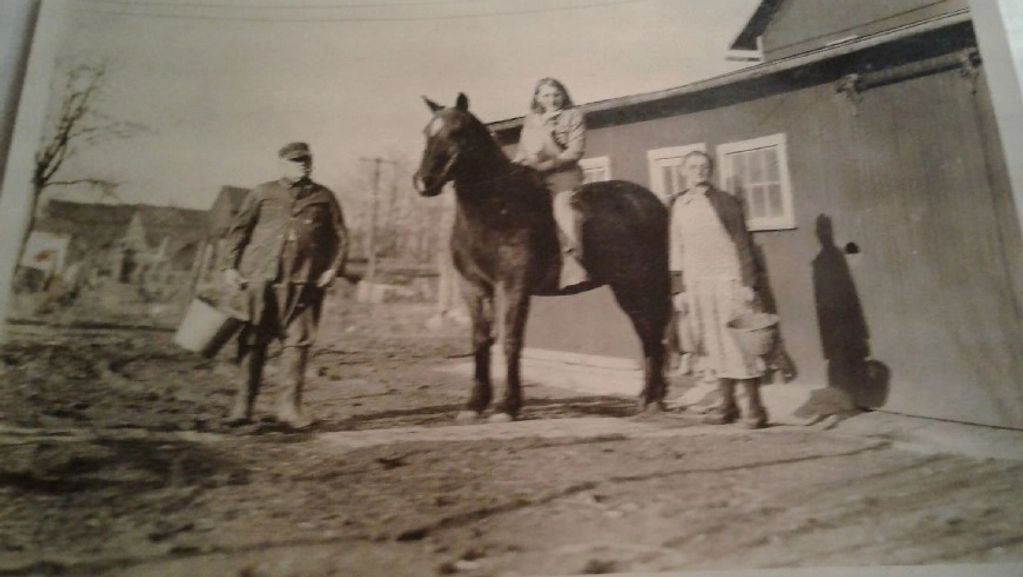 Picture of Joseph & Catherine (Kit) Hershey standing with their adopted daughter Emma Elizabeth King on the horse outside by the barn that still stands today.