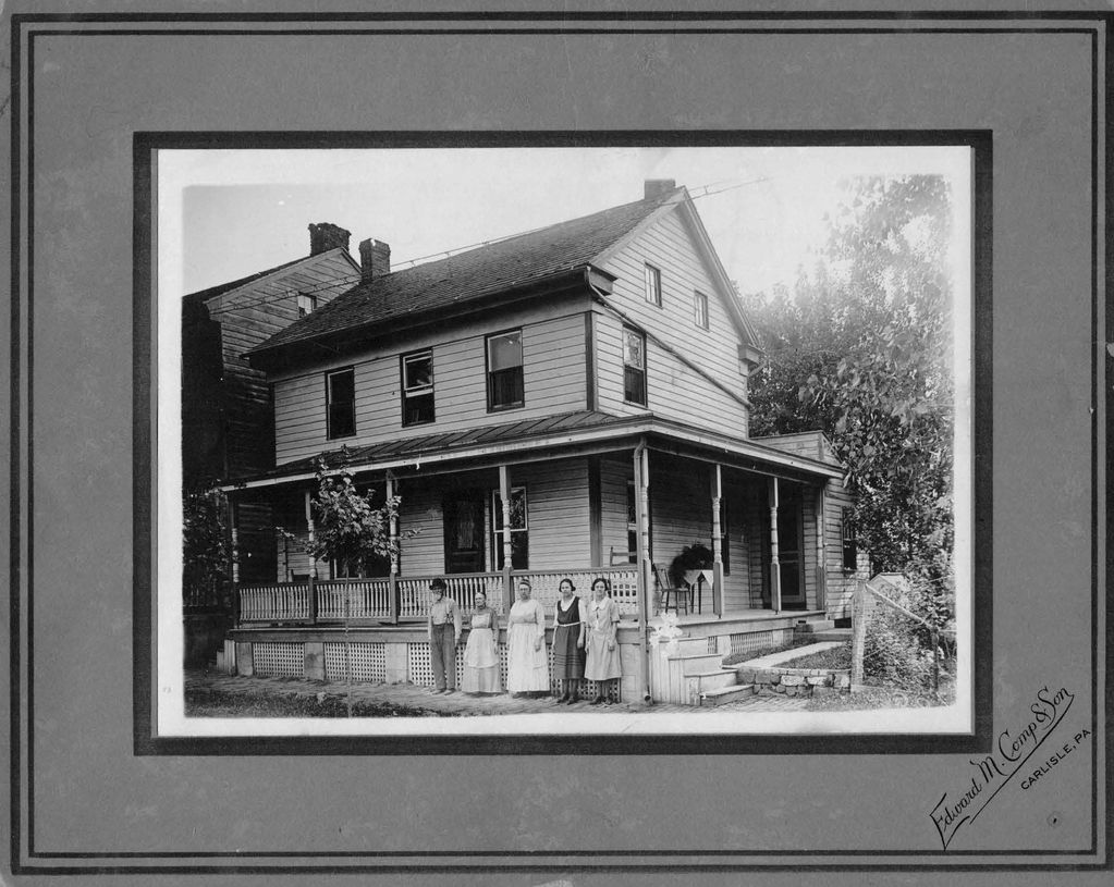 Picture of McCreary Home, 33 S. Baltimore St., donated by Donna Knisley. First three individuals are McCreary's, Last two individuals are Ethel Wonders and Ethel Henry